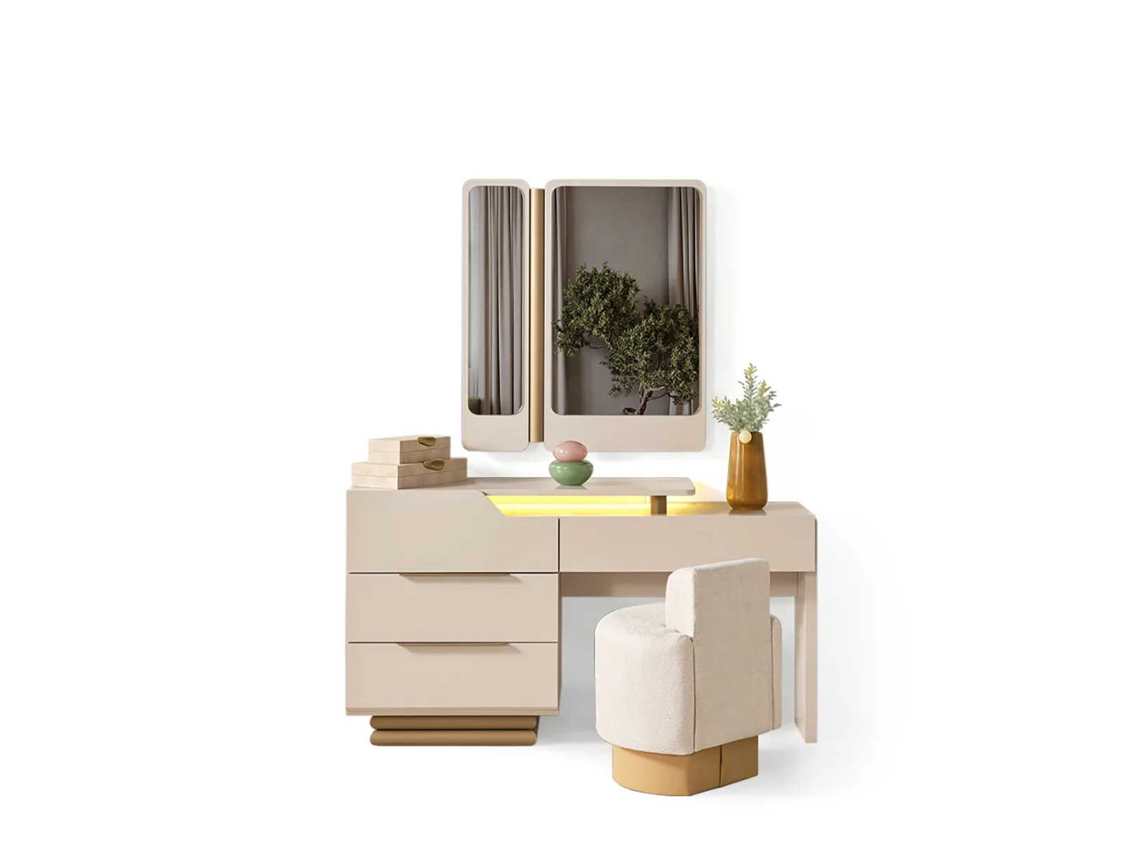 Üst tabla; dekoratif yerleşimler, günlük eşyalar veya ayna ile birlikte kullanım için dengeli bir alan sunar.