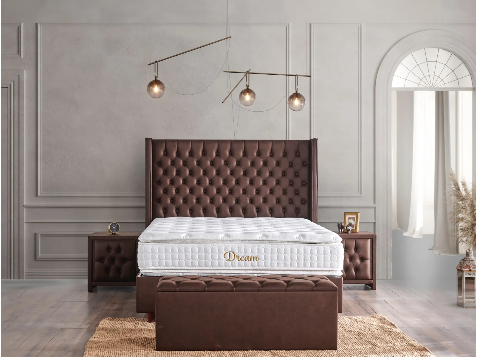 Ottoman başlık, kapitone detayları ve geniş formuyla yatak odasında güçlü ve dengeli bir duruş sergiler.