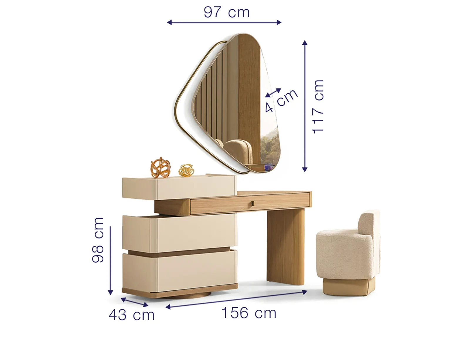 43 cm derinlik, odada yer tasarrufu sağlarken kullanım konforunu korur.