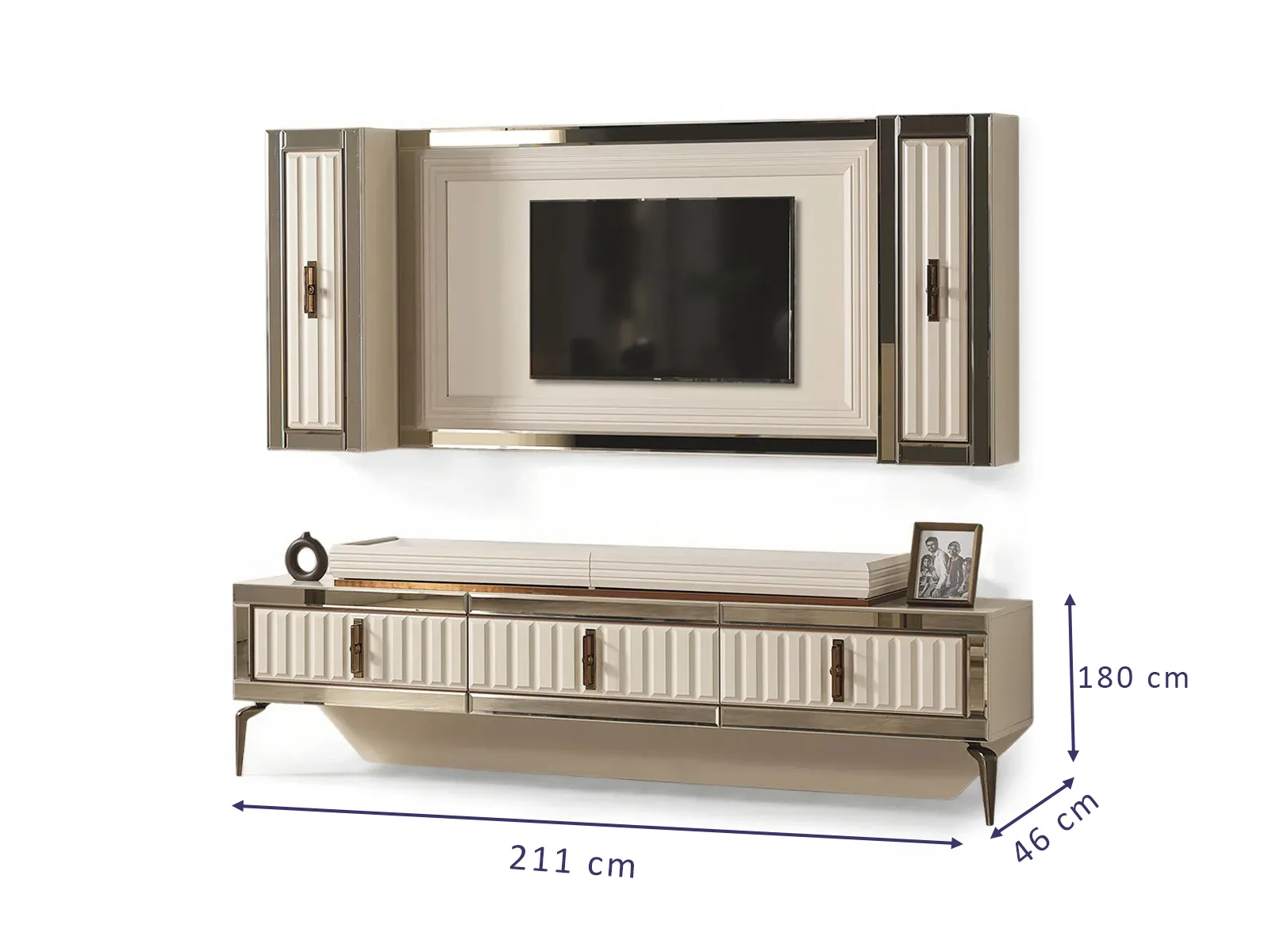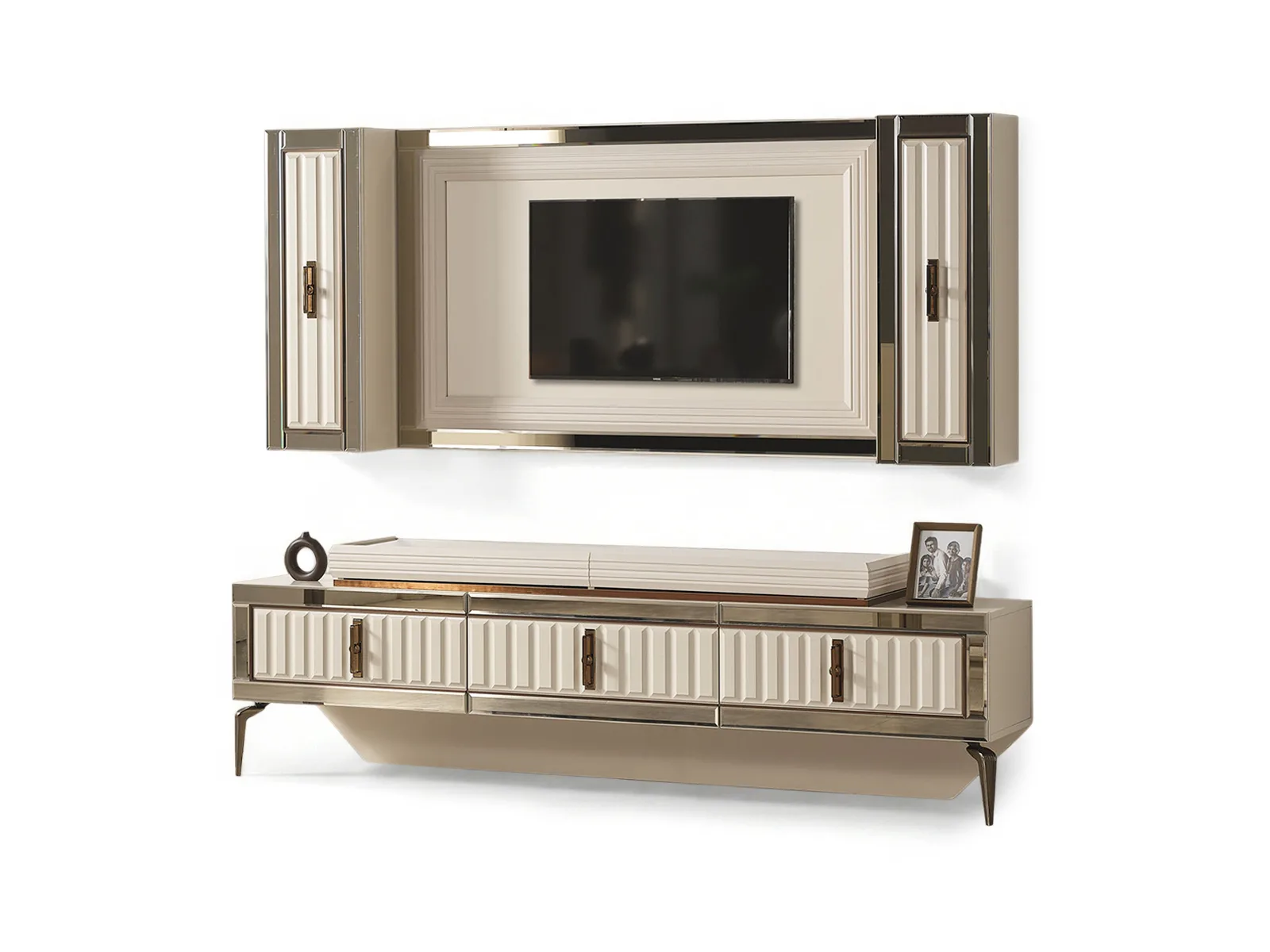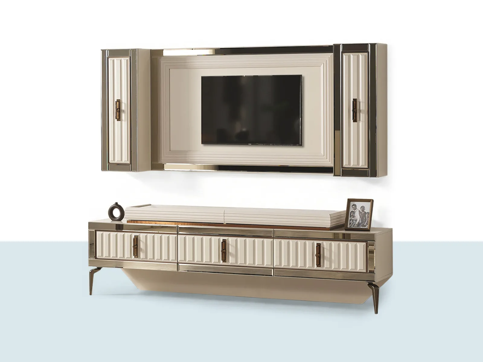 Milenyum TV Ünitesi, çerçeveli merkez paneli ve dikey desenli kapak detaylarıyla
