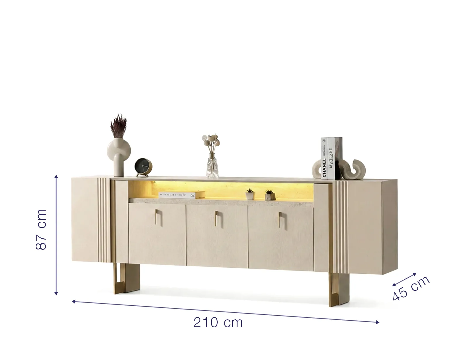 210 cm’lik genişlik; servis hazırlığı, dekoratif objeler ve günlük kullanım için rahat bir üst yüzey alanı sunar.