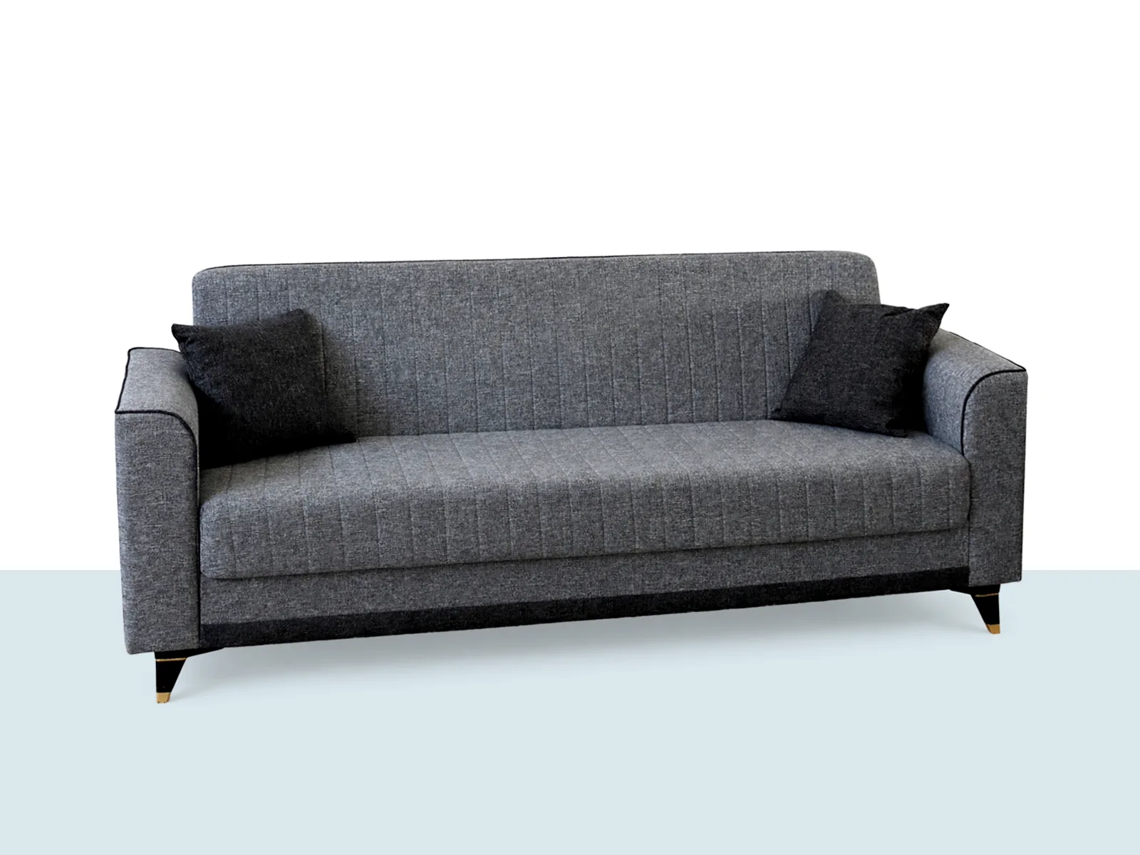 Takım içeriğinde yer alan kanepe; yatak olabilen yapısı, sandıklı depolama alanı ve dengeli oturum konforuyla öne çıkarken,