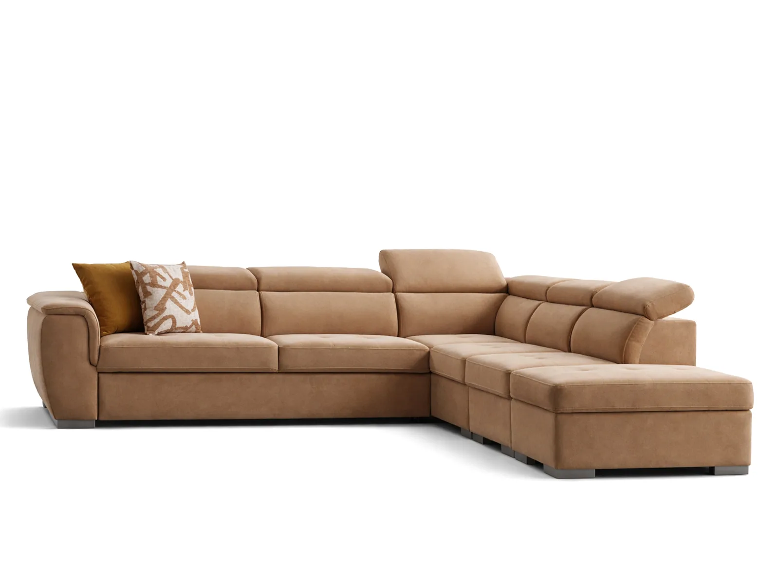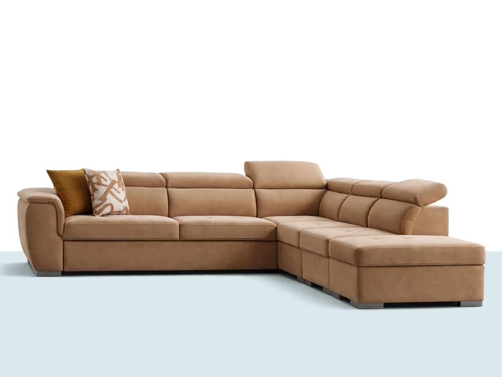 Köşe formuna entegre uzanma modülü, geniş oturum alanı ve destekleyici sırt yapısı ile