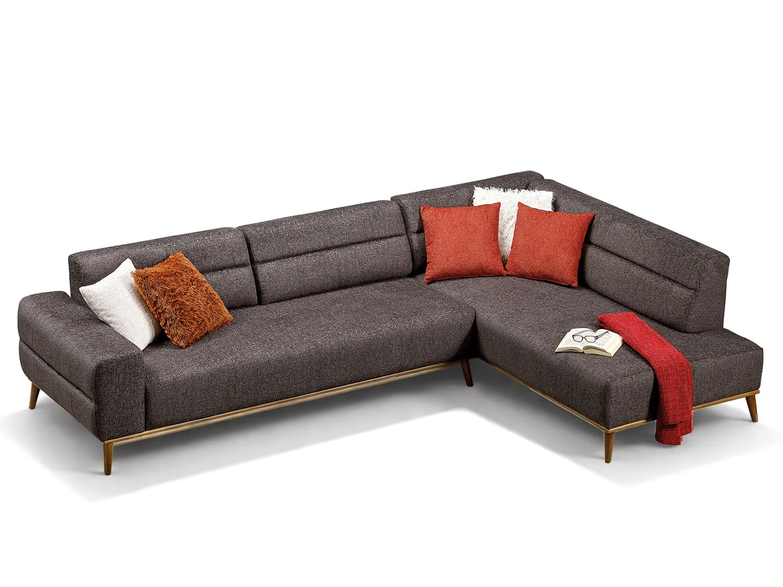 Kahverengi dokulu kumaşlı, ahşap ayaklı modern köşe koltuk; sağ taraf şezlong uzatmalı
