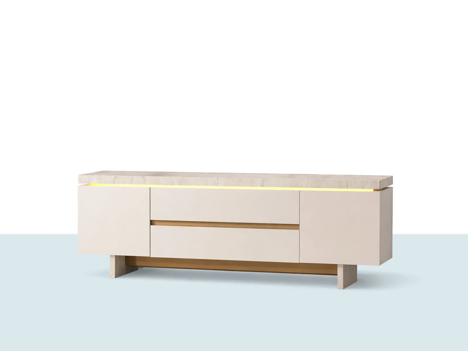 Açık renk gövde, alanı daha “aydınlık” gösterir; ahşap ayaklar ve sıcak ton detaylar ise