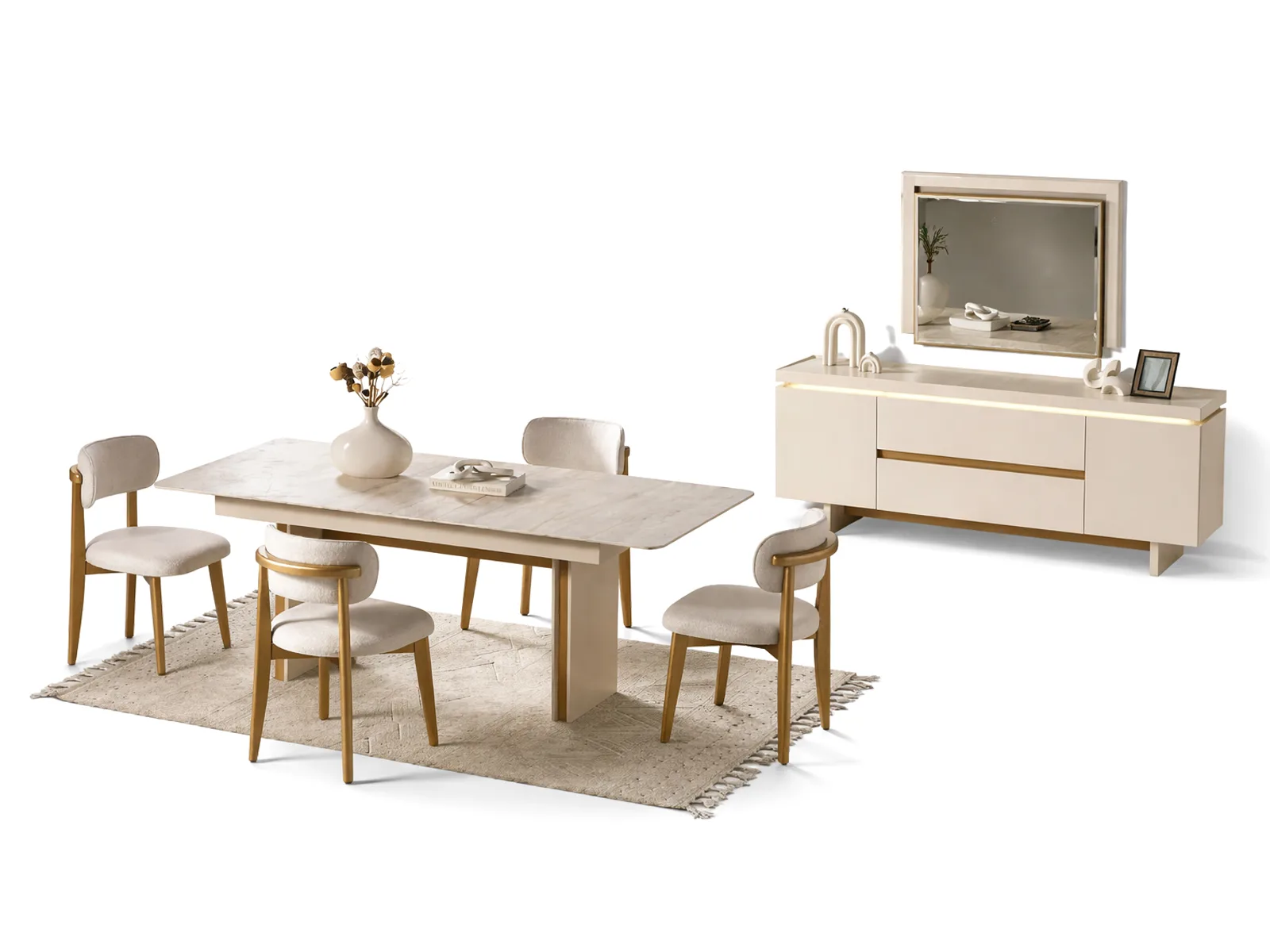 masa & sandalye ile başlayıp konsol, ayna ve seri modülleriyle genişleyebilir.