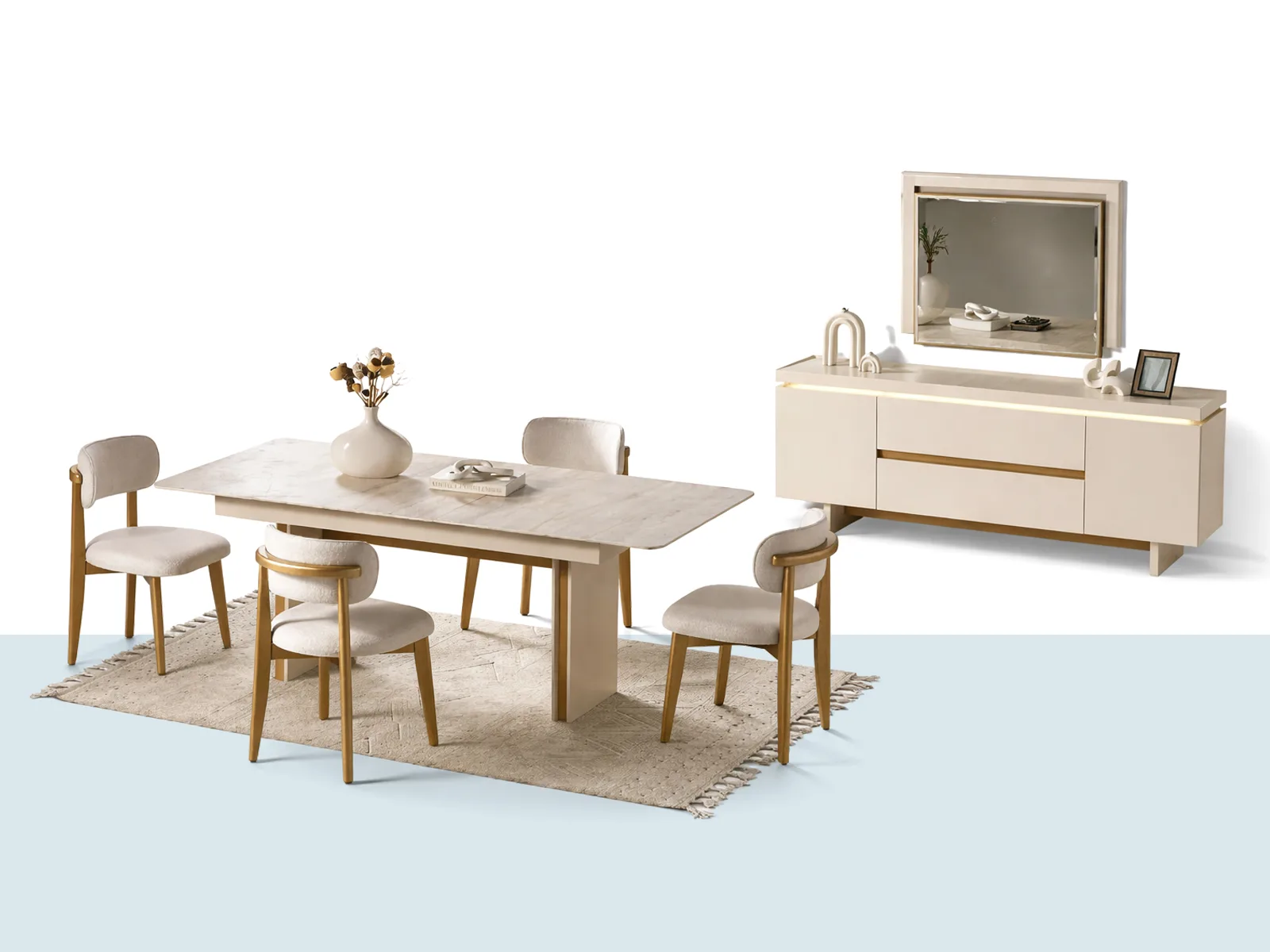Robin Yemek Odası Takımı; seçtiğiniz pakete göre masa & sandalye ile başlayıp konsol, ayna ve seri modülleriyle genişleyebilir.